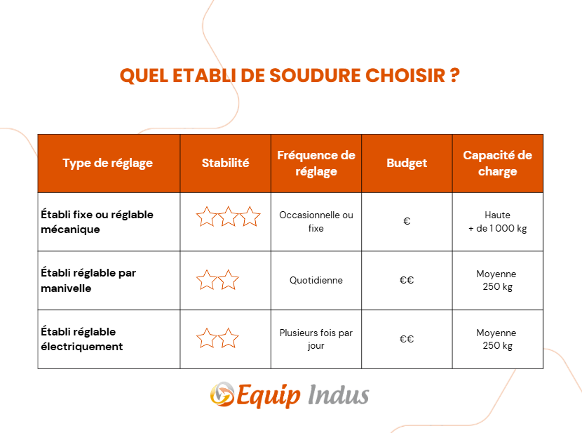 Le choix du piètement est aussi important que celui du plateau. Selon la fréquence de changement d'opérateur ou la taille des pièces à souder, plusieurs solutions s'offrent à vous :